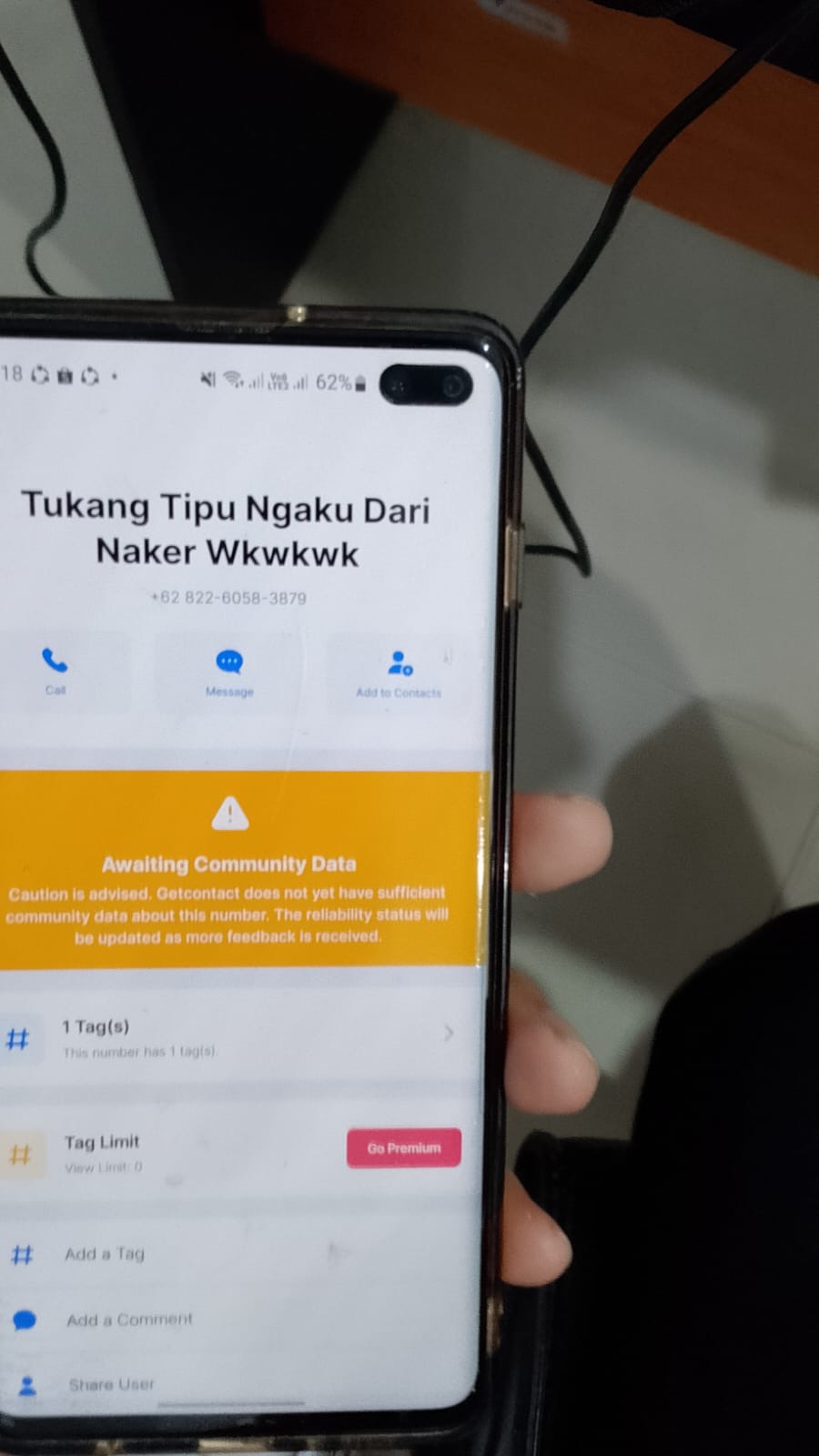Penelusuran lebih lanjut melalui aplikasi identifikasi nomor telepon, Getcontact, menunjukkan, nomor pelaku telah diberi tag “Tukang Tipu Ngaku Dari Naker Wkwkwk” oleh beberapa pengguna lain.